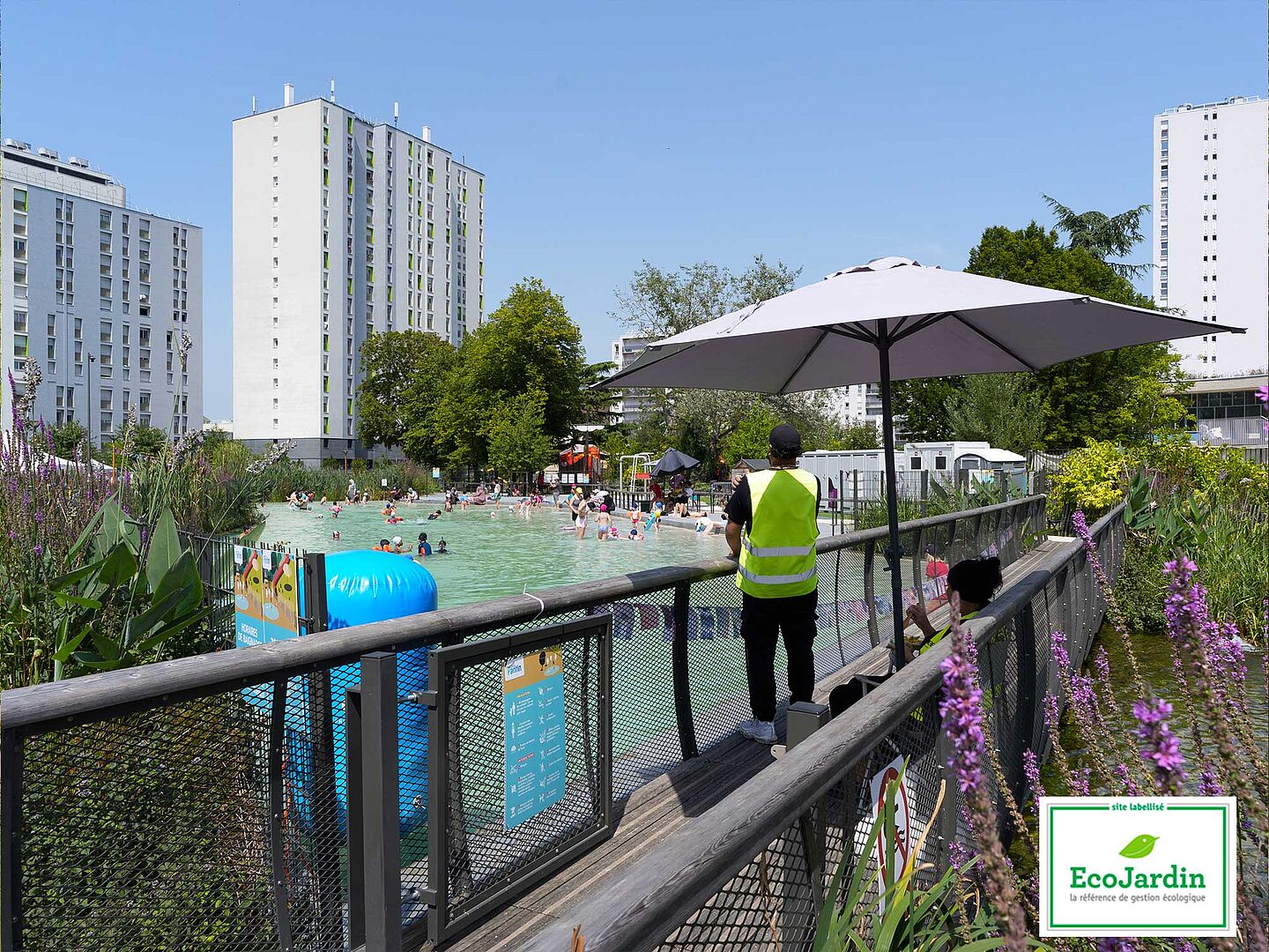 Formant le cœur du parc, l’espace de baignade est un incontournable des étés pantinois. Face à un ponton en bois, un bassin de 1 500 m2 et de 1,10 mètre de profondeur, encadré par six agents de surveillance. Autour, un jardin aquatique et une plage pour se prélasser.