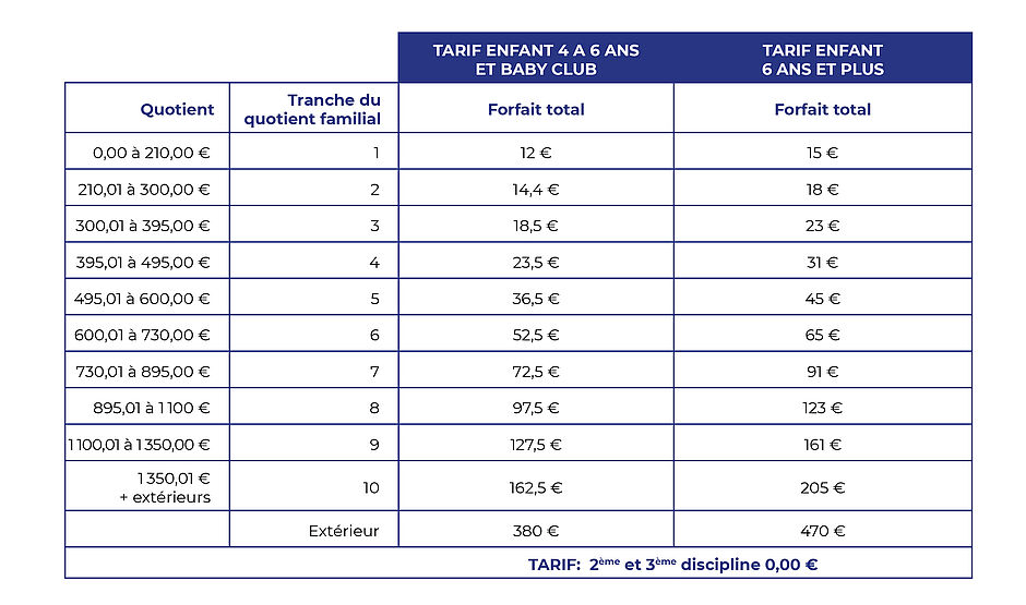 Une grille tarifaire s’applique à l’ensemble des activités Émis de Pantin. Elle indique les tarifs des activités calculés en fonction des 10 tranches du quotient familial et ceux pour les familles résidant hors de Pantin.